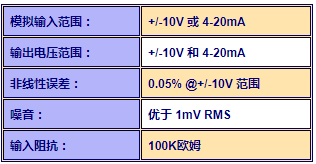 用戶可以使用單個跳線將模擬輸入配置為 -10V 至 +10V 或 4-20 mA。接收器將輸出 - 4-20 mA 信號(輸入范圍為 0 至 +10V 或 4-20mA,根據選擇)以及 4-20 mA 電流環路信號。